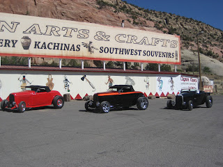 It was a short 70 miles to Dons place, had a great BBQ dinner, meet the others of the group. Traveling down the interstate I caught a pea size rock in the forhead thrown from a late model full fendered Gran Prix...that hurt!! No damage, no blood, just sore for a while. The rest of the trip will now be known as "The Greybeard Great Adventure #3" They all have tops...all but us. There is a 56 Chevy, 40 Ford coupe, 34 roadster, 32 3window, a couple of deuce roadstesr (with tops) and our rpu. We are leaving at 7AM in the morning....off to Albuquerque. Don made some red windshield strips stating the Greybeard Adventure #3, fun.